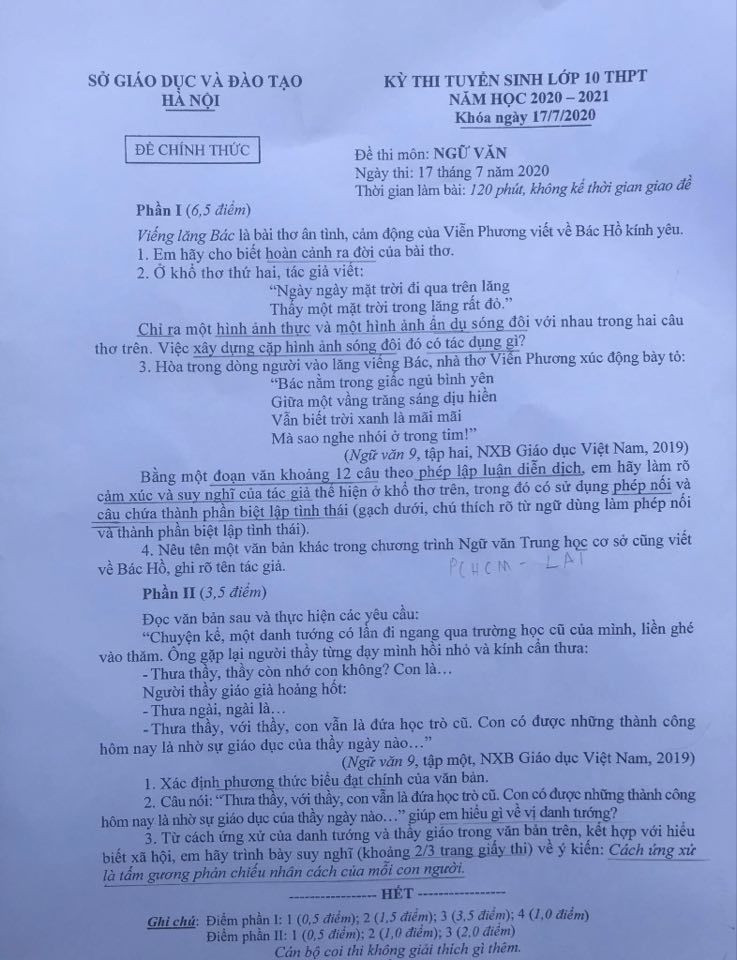 - Đề Ngữ văn vào 10 Hà Nội năm 2020