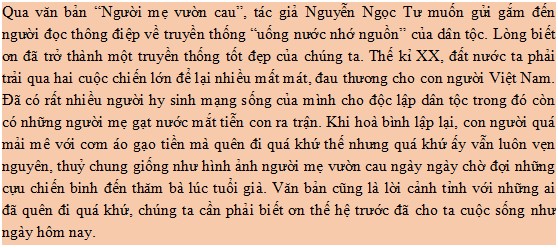 Văn bản Người mẹ vườn cau viết về đề tài biết ơn mẹ Việt Nam anh hùng. Đây cũng là truyền thống uống nước nhớ nguồn của dân tộc ta.