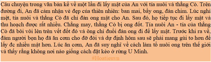 An đi lấy mật cùng với tía nuôi và thằng Cò. Trên đường đi, An đã cảm nhận vẻ đẹp của thiên nhiên: ban mai, bầy ong, đàn chim, v.v... Lúc nghỉ mệt, tía nuôi và thằng Cò đã chỉ đàn ong mật cho An. Sau đó, họ tiếp tục đi lấy mật và thu hoạch được rất nhiều. Chẳng may, thằng Cò bị ong đốt. Tía nuôi An - tía của thằng Cò đã bôi vôi lên trên vết đốt đó và ông chỉ đuổi đàn ong đi để lấy mật. Trước khi ra về, đám người bọn họ đã ăn cơm cho đỡ đói và dự định hôm sau sẽ phải mang gùi to hơn để lấy được nhiều mật hơn. Lúc ăn cơm, An đã suy nghĩ về cách làm tổ nuôi ong trên thế giới và thấy rằng không nơi nào giống cách đặt kèo ở rừng U Minh.
