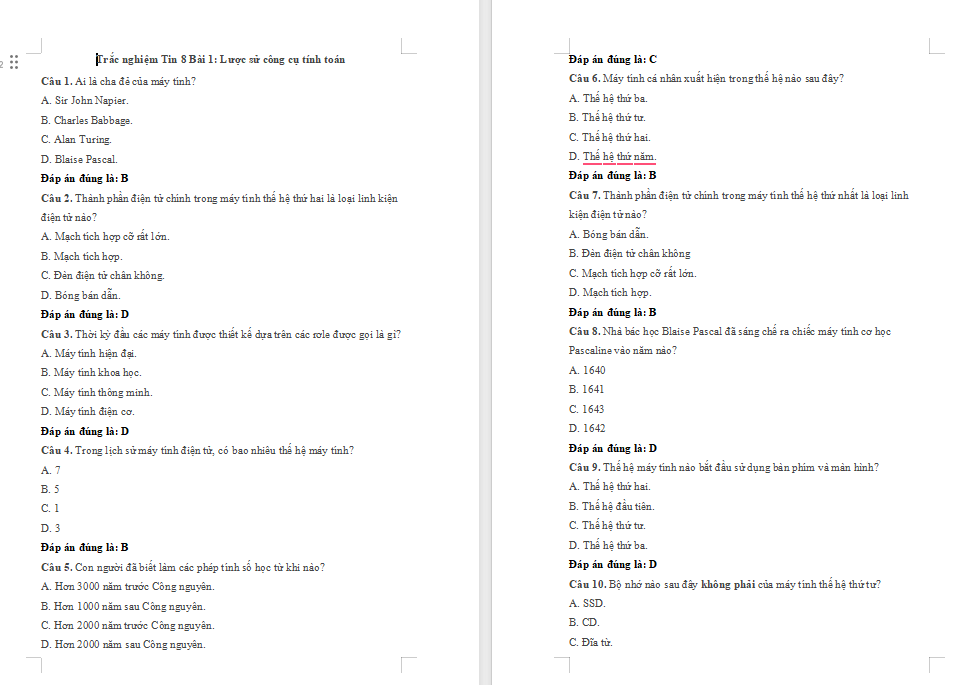 Trắc nghiệm Tin học 8 Bài 1 Lược sử công cụ tính toán